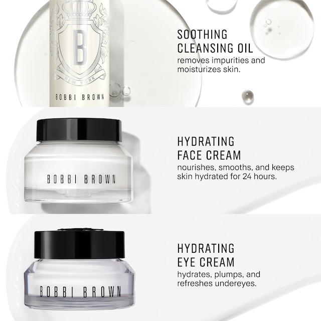 Ingredients: Water\Aqua\Eau, Ethylhexyl Palmitate, Squalane, Butylene Glycol, Cetyl Alcohol, Glyceryl Stearate, Hydrogenated Vegetable Oil, Simmondsia Chinensis (Jojoba) Seed Oil, Persea Gratissima (Avocado) Oil, Hamamelis Virginiana (Witch Hazel) Extract, Aloe Barbadensis Leaf Juice, Cholesterol, Peg100 Stearate, Glycerin, Sodium Pca, Trehalose, Ascorbyl Palmitate, Ethylhexylglycerin, Hydroxyproline, Proline, Acrylates Copolymer, Phytantriol, Glycine, Linoleic Acid, Phytosphingosine, Sodium Hydroxide, Tocopheryl Acetate, Sodium Hyaluronate, Tocopherol, Carbomer, Disodium Edta, Phenoxyethanol Rds Product Name: Hydrating Face Cream Division: Bb (Bobbi Brown)Ingredients: Water\Aqua\Eau, Dimethicone, Butylene Glycol, Cetyl Alcohol, Ethylhexyl Palmitate, Caprylic/Capric/Myristic/Stearic Triglyceride, Aleurites Moluccanus Seed Oil, Myristyl Myristate, Glyceryl Stearate, Algae Extract, Cetyl Phosphate, Sodium Hyaluronate, Trehalose, Tocopheryl Acetate, Coriandrum Sativum (Coriander) Seed Oil, Rosmarinus Officinalis (Rosemary) Leaf Oil, Rosa Canina (Rose) Fruit Oil, Elettaria Cardamomum Seed Oil, Lavandula Angustifolia (Lavender) Oil, Jasminum Grandiflorum (Jasmine) Flower Extract, Cholesterol, Linoleic Acid, Glycerin, Caffeine, Peg10 Dimethicone, Myristyl Laurate, Phytantriol, Acrylates Copolymer, Lecithin, Phytosphingosine, Propylene Glycol Stearate, Polysorbate 20, Polydecene, Caprylyl Glycol, Sorbitan Laurate, Myristyl Alcohol, Propylene Glycol Laurate, Glycine, Sodium Hydroxide, Carbomer, Hydroxyproline, Proline, Hexylene Glycol, Tocopherol, Ascorbyl Palmitate, Disodium Edta, Phenoxyethanol, Potassium Sorbate Rds Product Name: Soothing Cleansing Oil Reform Division: Bb (Bobbi Brown)Ingredients: Isopropyl Palmitate, Pentaerythrityl Tetraethylhexanoate, Polybutene, Peg20 Glyceryl Triisostearate, Isohexadecane, Peg8 Diisostearate, Aleurites Moluccanus Seed Oil, Peg12 Diisostearate, Tocopherol, Limnanthes Alba (Meadowfoam) Seed Oil, Olea Europaea (Olive) Fruit Oil, Helianthus Annuus (Sunflower) Seed Oil, Methyldihydrojasmonate, Simmondsia Chinensis (Jojoba) Seed Oil, Jasminum Officinale (Jasmine) Flower Wax, Calophyllum Inophyllum Seed Oil, Camellia Japonica Seed Oil, Lavandula Hybrida Oil, Lavandula Angustifolia (Lavender) Oil, Bisabolol, Glycerin, Glyceryl Laurate, Water\Aqua\Eau, Pentylene Glycol, Dipentaerythrityl TriPolyhydroxystearate, Linalyl Acetate, Tocopheryl Acetate